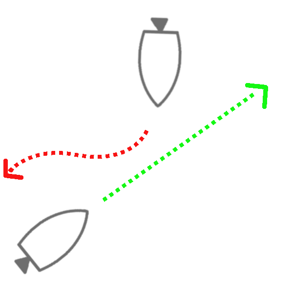 3. Zwei Motorboote fahren so, dass sich ihre Kurse kreuzen würden. Dazu heißt es in den KVR: “Wenn die Kurse zweier Maschinenfahrzeuge einander so kreuzen, dass die Möglichkeit der Gefahr eines Zusammenstoßes besteht, muss dasjenige ausweichen, welches das andere an seiner Steuerbordseite hat; wenn die Umstände es zulassen, muss es vermeiden, den Bug des anderen Fahrzeugs zu kreuzen.” Das ist also umständlich ausgedrückt für “Rechts vor Links”, aber vermutlich wollte man hier bewusst den Vergleich mit dem Straßenverkehr vermeiden.